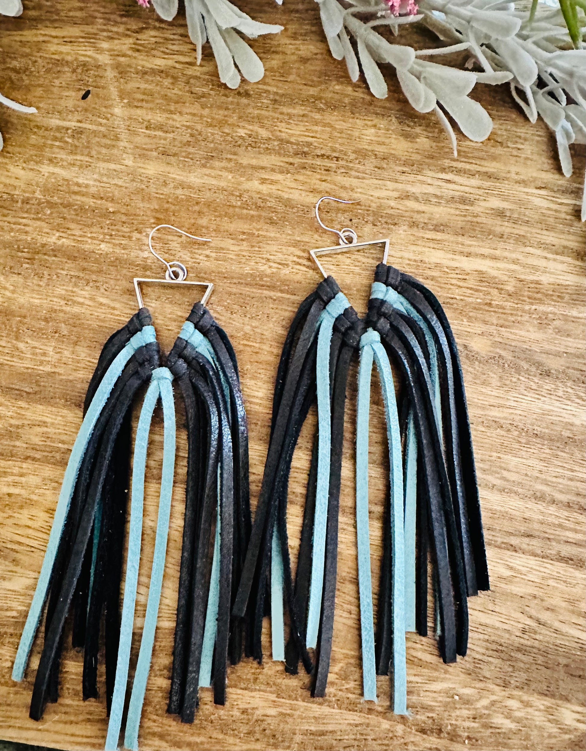 These are made with very soft, black and turquoise leather. They measure 5 inches long.