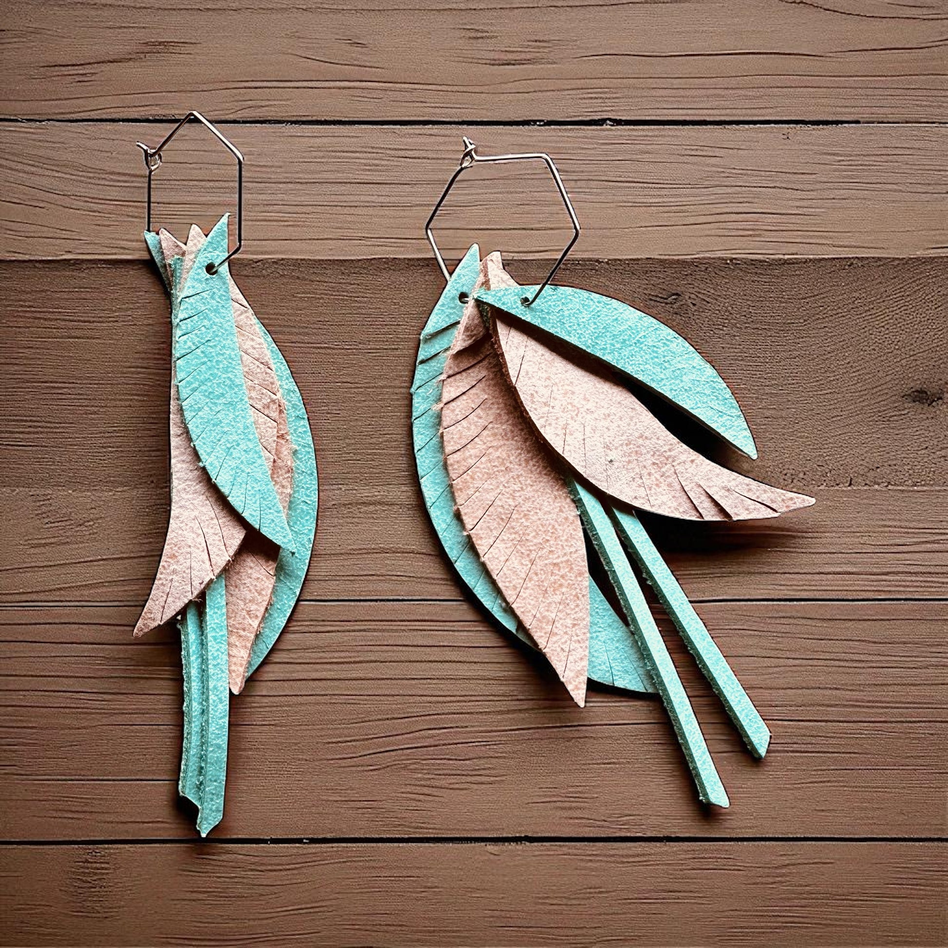 These earrings have a playful, nature-inspired design. They feature multiple layered pieces shaped like elongated leaves or feathers, crafted from soft pastel-colored leather —a mix of light orange and mint. The overlapping layers add a sense of depth and movement, almost like cascading feathers. These measure 4 in long and have stainless steel hoops.