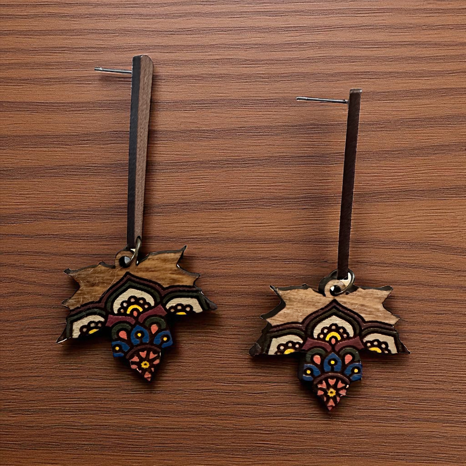 These earrings are handcrafted from wood and have a striking, artistic design. Each earring features a long, narrow rectangular wooden bar connector. The leaf is shaped with pointed, leaf-like edges, giving it an organic and natural appearance. It has a symmetrical, layered pattern resembling a stylized flower or mandala.